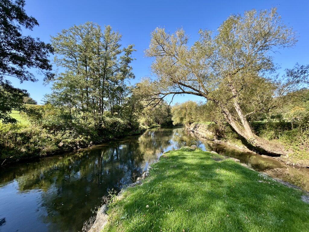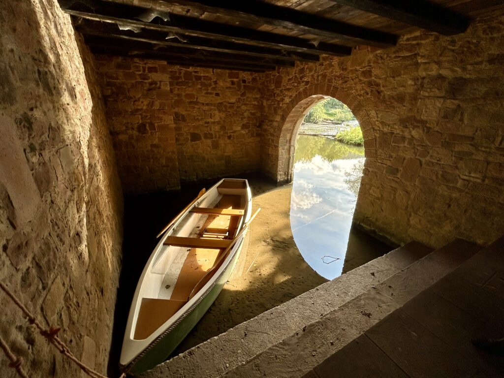Der Fluss, der sanft am Anwesen vorbeizieht, ist mehr als nur Kulisse – er ist ein stiller Begleiter. Sein leises Murmeln trägt eine Ruhe in sich, die man selten findet. Wer sich im Liegestuhl am Ufer niederlässt, spürt, wie die Gedanken leichter werden. Das Grün ringsum, das Spiel des Lichts auf dem Wasser, die frische Luft: Es ist ein Moment, der sich anfühlt wie ein tiefes Durchatmen.